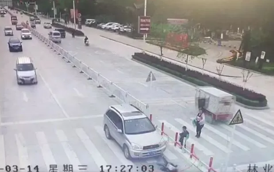 结果被驶来的一辆越野车撞倒在地。此时妈妈才缓过神来,赶紧上前扶小孩。