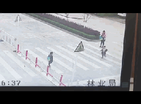 等一个小朋友快走到对面马路时,回头看到妈妈还在原地捧着手机,于是小孩就跑了回去,殊不知危险已在眼前。