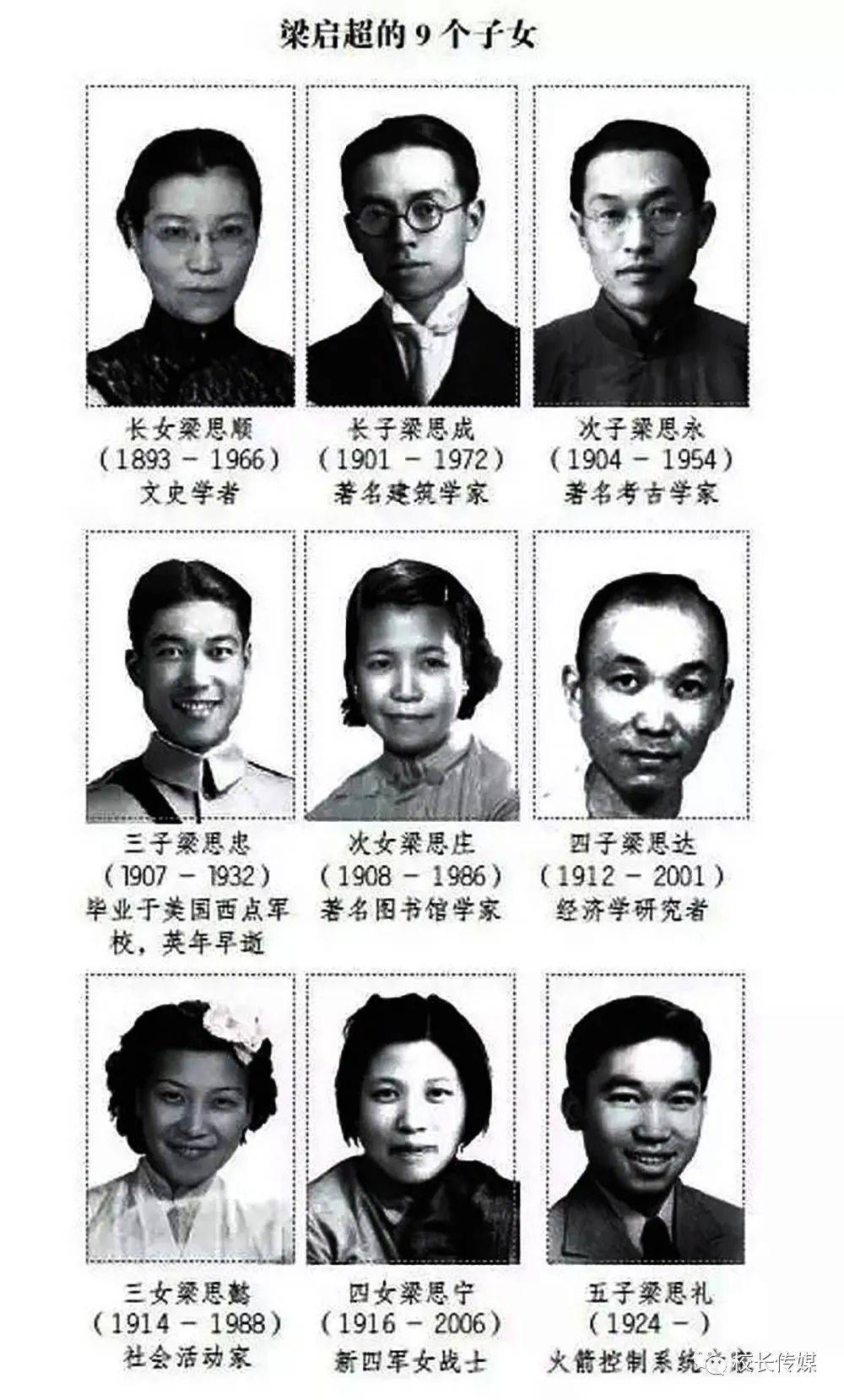 梁启超一共有9个子女,满门俊秀,个个成才,有着“一门三院士,九子皆才俊”的美称。