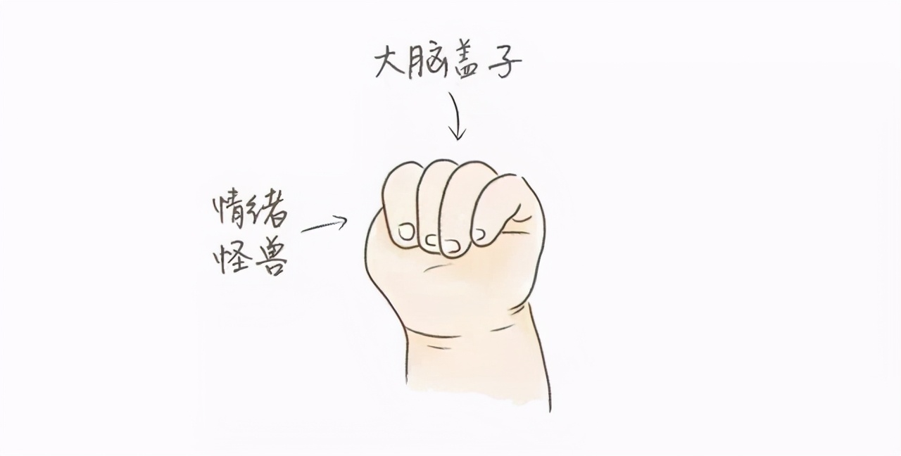 我们的大脑,就像一个拳头,大拇指是最可怕的情绪怪兽,另外四个指头是″大脑盖子″。 当我们平静时,大拇指放在手心里握成拳头,″大脑盖子″是合上的,情绪怪兽也就被关在里面。