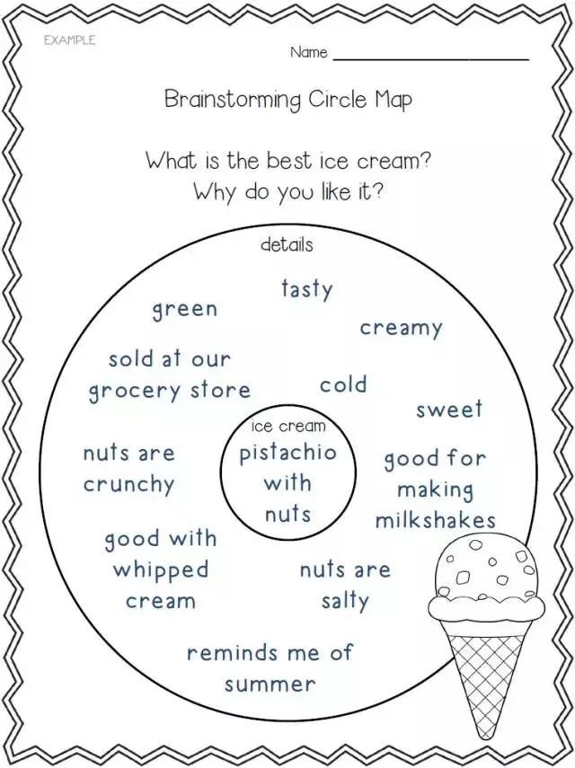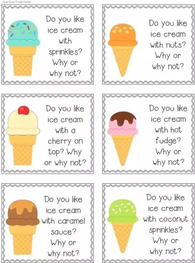 比如说这个写作话题是”What is the best ice cream (什么是最好的冰淇淋)?”,就让每个人拿一种冰淇淋的卡片,找一个伙伴说出手中卡片上的冰淇淋是最好吃的原因。然后两两交换卡片,再练习下一张卡片。依次重复,孩子即听到了同伴的答案,也练习了几种不同的话题。