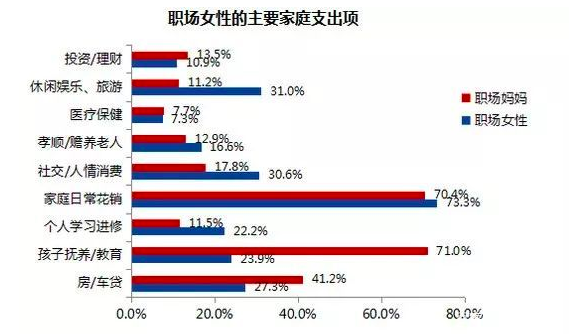 对于到手的收入,职场妈妈们几乎都花在了“孩子抚养/教育”上。根据淘宝网公布的中国人消费大数据显示,中国女性的购物记录很多是儿童用品、家具和度假,而男性最常消费的是外卖、手机和游戏。