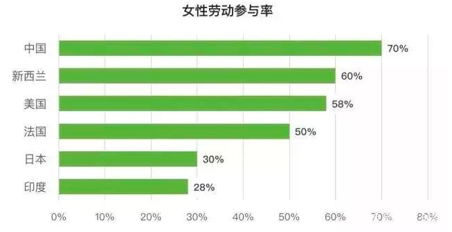 美国国家统计局曾对各国劳动人口参与劳动的比率发表过一组调查数据,结果显示:在中国,女性参与劳动的几率达到70%,远超其他国家!