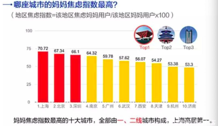 这也难怪,在一份关于《中国妈妈“焦虑指数”报告》里,妈妈焦虑指数排名前十的城市均为一二线城市,其中最焦虑的是上海妈妈,以超70的焦虑指数高居榜首。