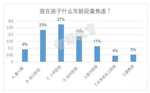 2、小学阶段(27%)、幼儿阶段(23%)和初中阶段(19%)的父母最焦虑。