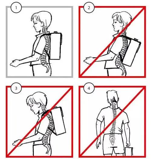过重的书包会把孩子的双肩向后拉扯,这时孩子会不自觉地前倾,时间一长就会导致驼背、含胸,甚至脊柱侧弯和高低肩。