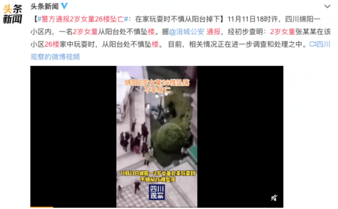 11 月 2 日,重庆某小区两个孩子从高楼坠下,抢救无效后身亡;