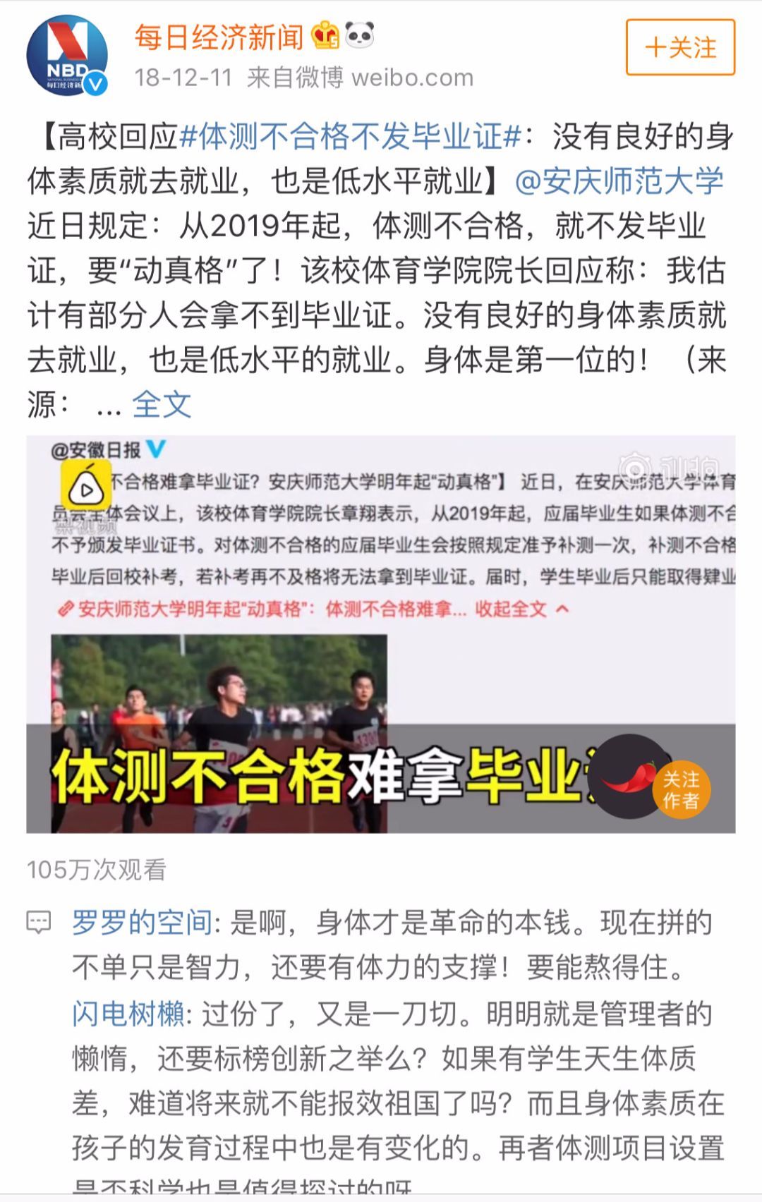 安庆师范大学近日规定,自2019年起,体测不合格,就不发毕业证。