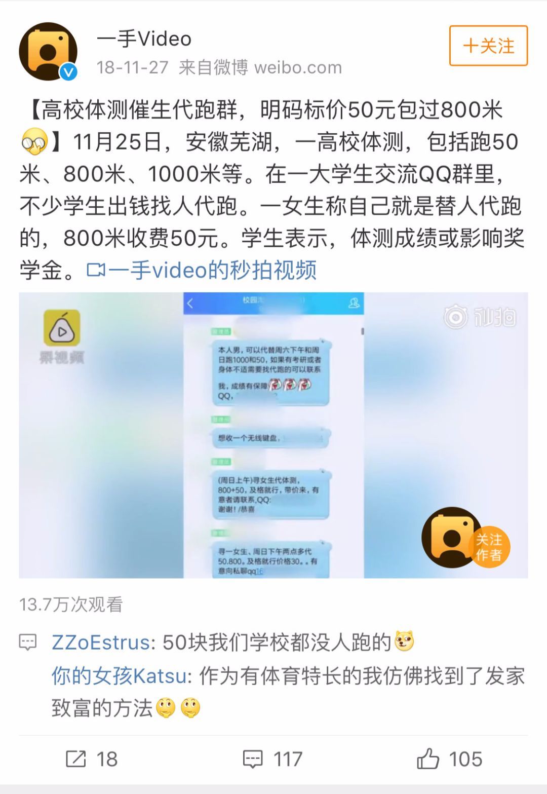 高校体测催生“代跑”行业,明码标价代人跑50米、1000米。