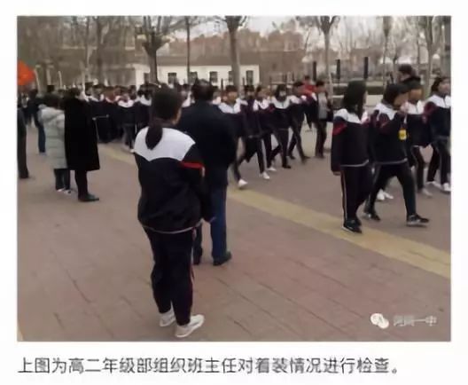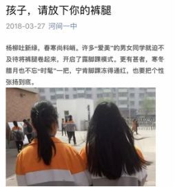 河北沧州河间市第一中学为了纠正学生们这种不惜损伤身体追逐“时尚”的做法,每天检查学生是否露脚踝,并在学校微信公众号中发布一篇《孩子,请放下你的裤腿》的文章。