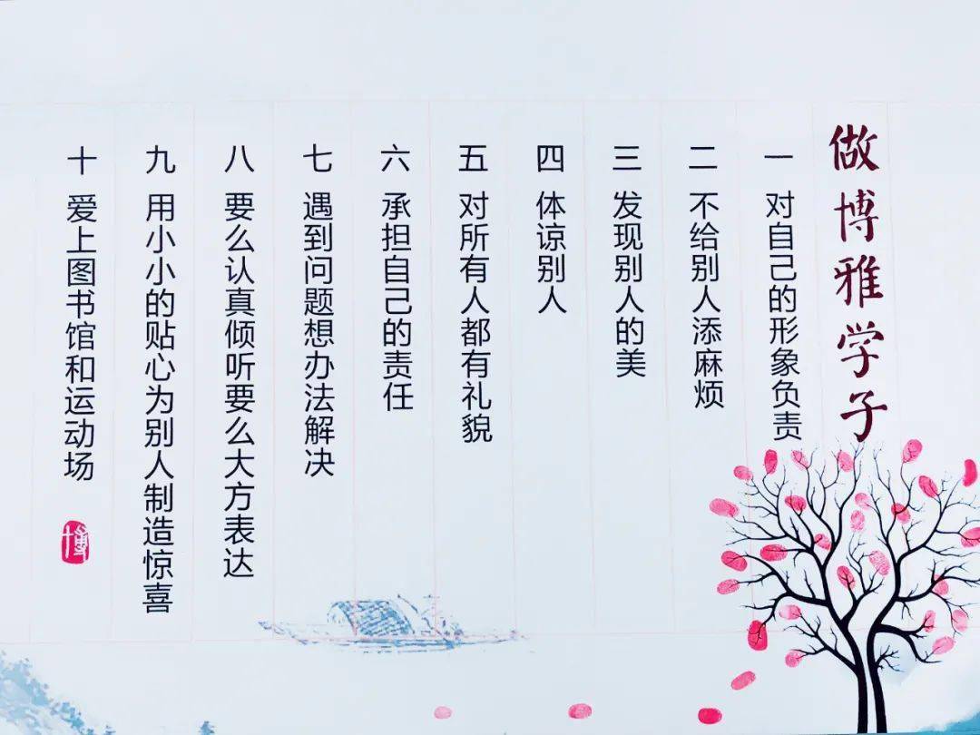 192班的墙壁上粉刷出一页书笺,淡淡的米黄色,似有似无的远山衬托其间,黑色竖线间写着12条“做博雅学子”的要求:对自己的形象负责;不给别人添麻烦;发现别人的好;体谅别人;用小小的贴心为别人制造惊喜;要么认真倾听要么大方表达;不随意;有条理地做事;遇到问题想办法解决;对所有人都有礼貌;自己的过错自己承担;爱上图书馆和运动场。形式与内容散发着一种和谐的美。