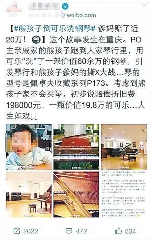 记得这则新闻吗?一个熊孩子拿水往亲戚的钢琴键上倒,孩子爹妈以“哎呀,小孩子不懂事”推脱,还反说“好心帮忙洗琴”。亲戚不好发火,于是笑眯眯夸熊孩子干得好——后来熊孩子再接再厉,在商场用可乐“洗”了一架60多万的进口钢琴,被索赔19.8万折旧费。