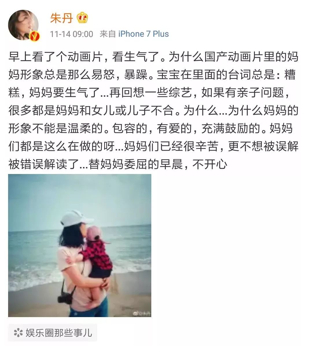 记得去年的时候,朱丹在微博上发飙,起因是动画片描述的妈妈形象让她生气。