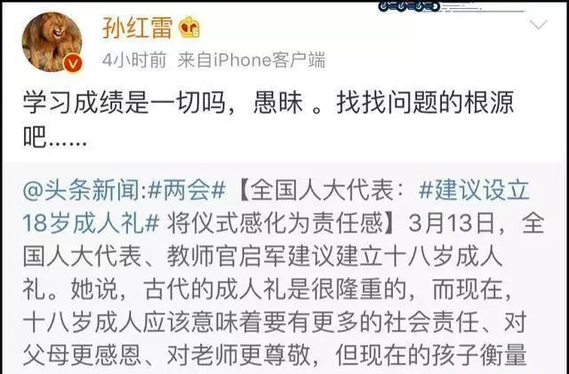 孙红雷随手转发力挺这一个观点,并且感叹留言:“学习成绩是一切吗,愚昧!”