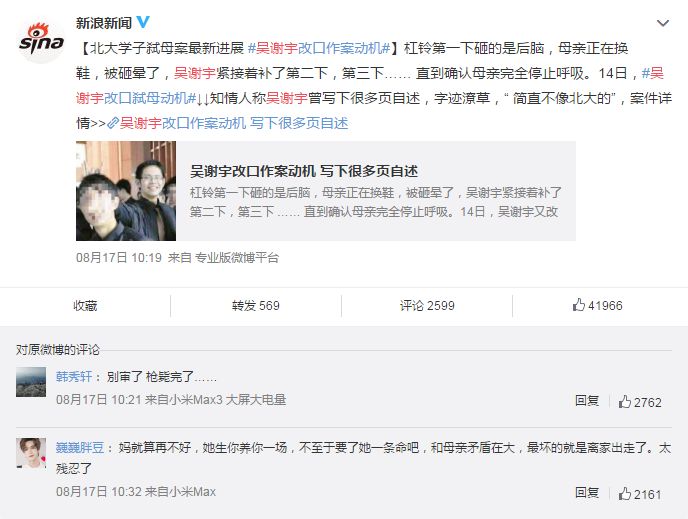 最近,北大学子弑母案有了新的进展:吴谢宇承认弑母,将弑母动机由“帮助母亲解脱”,改为“协助母亲自杀”。对这种说法,网友并不买账。