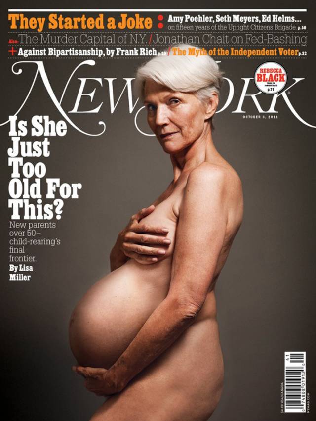63岁,《纽约周刊》。全裸出镜,大着怀孕9个月的“肚子”(这肚子是PS的)。这期封面是讨论50岁以上中年女性的生育问题,标题是“她做这个会不会太老了呢?”