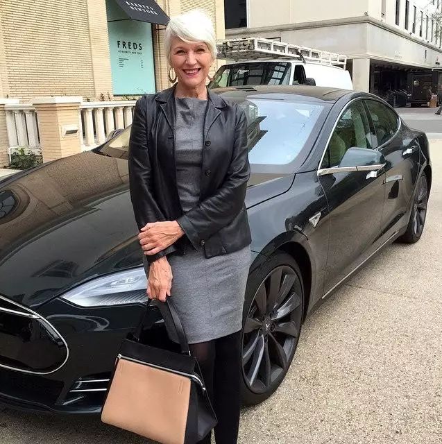 梅耶阿姨站在特斯拉汽车前