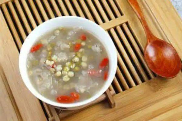 材料:绿豆60克,银耳15克,枸杞10克,白糖1~2匙。