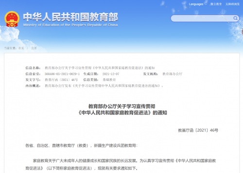 教育部办公厅关于学习宣传贯彻《中华人民共和国家庭教育促进法》的通知