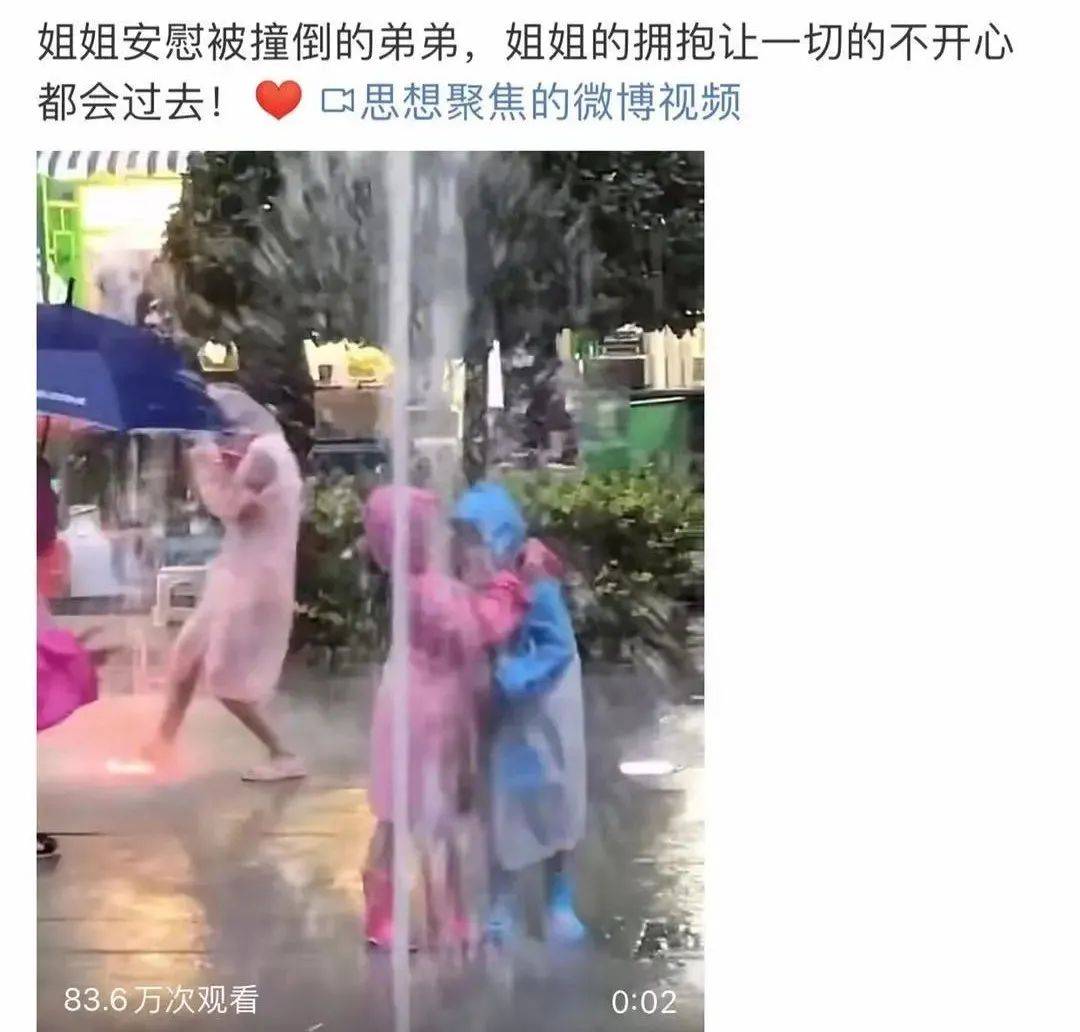 正在玩喷泉的弟弟被突然冲过来的大孩子撞倒,一旁的姐姐发现了弟弟的无助和委屈,急忙上前搂住他,笑着安慰。