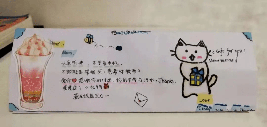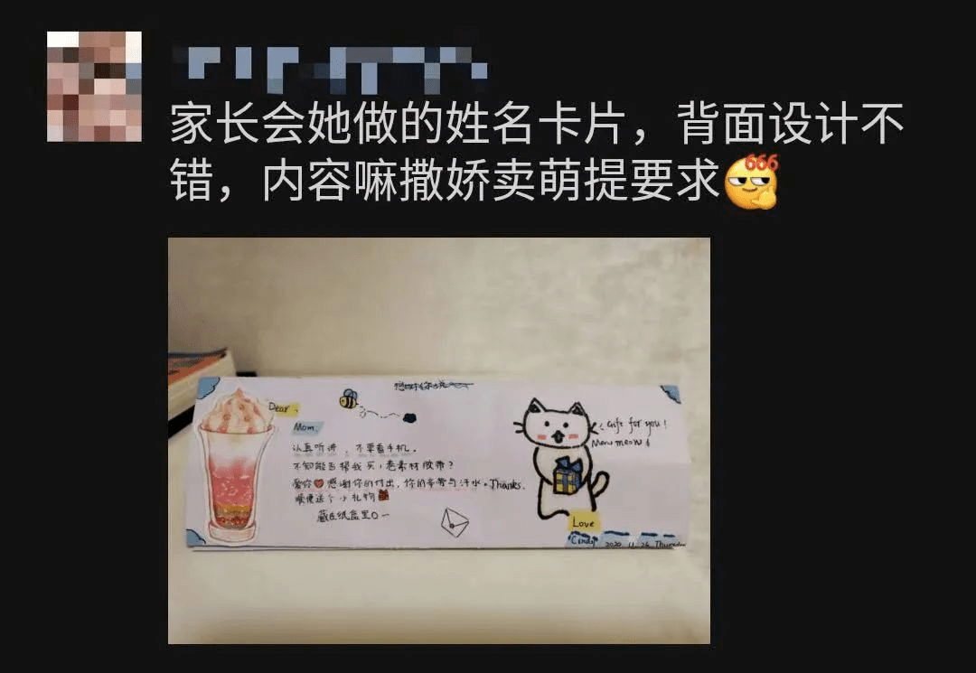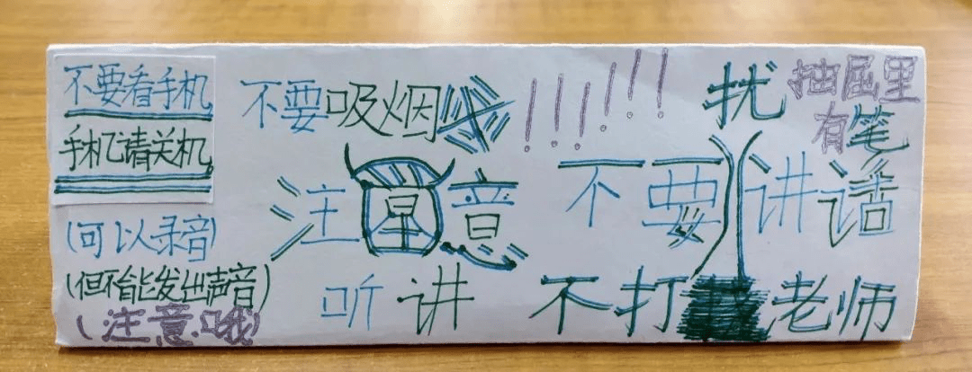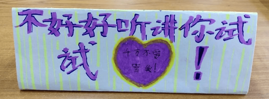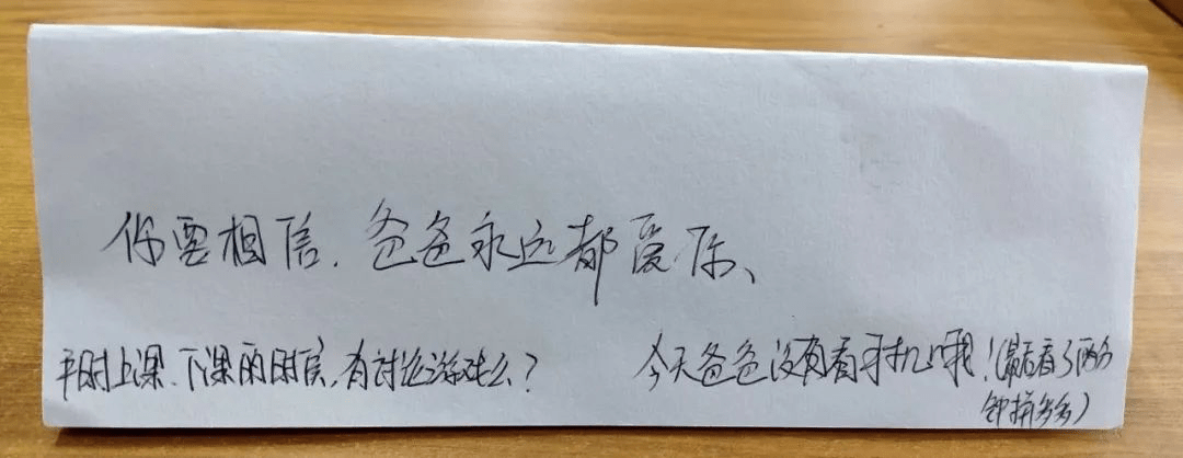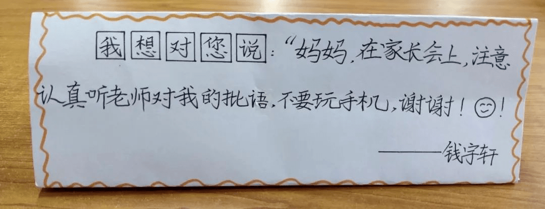 然而,班主任毛珺杰留意到,爸爸妈妈的表情在落座的那一刻发生了明显变化,因为看到了自家娃特意写在桌签背面的留言——