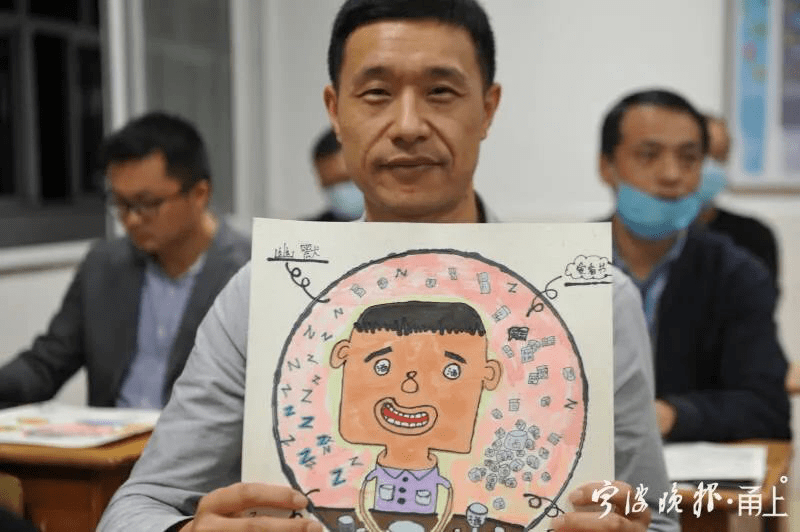 正当爸爸们一头雾水时,班主任吴艳霞老师揭开了谜底——班级里的每个同学都给自己的爸爸画了一副肖像,旁边还写了许多关于爸爸的印象,每位爸爸需要根据画像和文字,找到自己的位置。