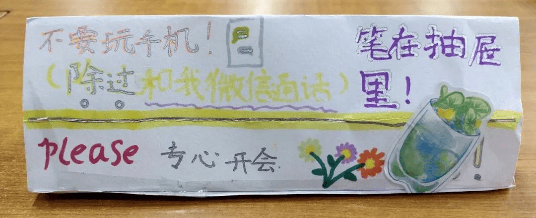 班主任表示,起初只是建议孩子有什么话想对爸妈说,可以写在桌签背面。“我的设想,是鼓励孩子趁此机会感谢一下爸爸妈妈。但孩子们可能比较腼腆,不太好意思这么写。刚好我举例时说起,开会要手机静音,所以很多孩子都写了这条。”