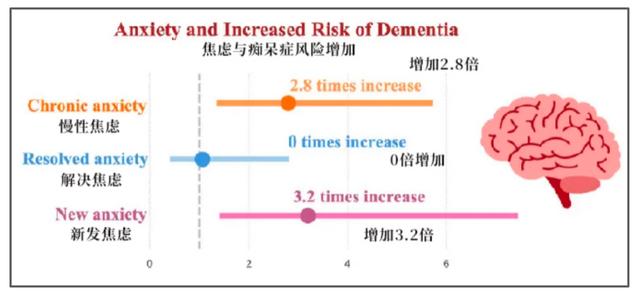 在平均10年的研究期间发现,慢性焦虑和新发焦虑的人与痴呆症风险增加有关,患有慢性焦虑、新发焦虑的人,与患痴老年呆症的风险高2.8倍和3.2倍相关。