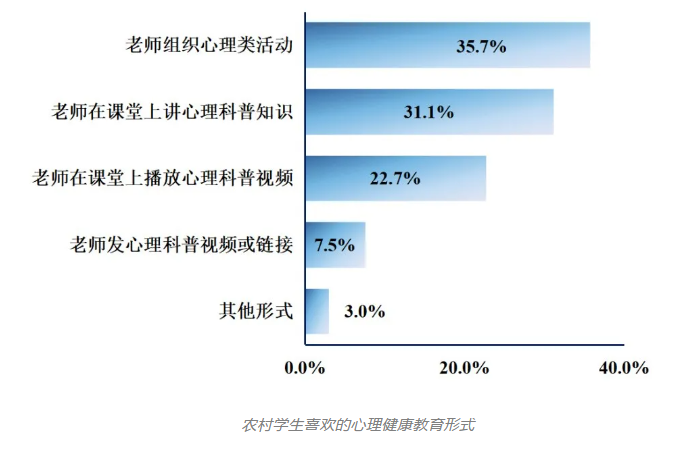 心理健康教育活动。报告指出,89.8%的学校开展心理课,农村学生最喜欢的心理健康教育方式是教师组织开展的心理类活动,而不是纯粹的讲授课程。