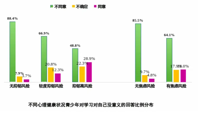 有留守经历、缺乏父母关怀及亲子沟通、师生关系疏远、同学关系不佳的青少年有更高的抑郁、焦虑风险;心理健康状况好的学生在学习上更努力、有更强的内部学习动机;而心理健康风险较高的学生有更高比例不想上学,学业韧性更差,学习效能感更弱。