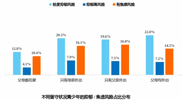 调查结果显示,在父母均外出的青少年中有29.2%存在抑郁风险,只有母亲外出或只有父亲外出两个群体中的抑郁风险的比例也分别达到28.3%和27.1%,高出非留守青少年十余个百分点。同样,留守青少年中存在焦虑风险的比例也显著高于非留守青少年。