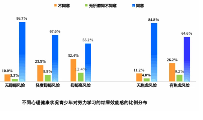 调查显示,无抑郁风险和无焦虑风险的青少年中,近九成相信自己能掌握学习内容,而轻度抑郁风险和抑郁高风险的青少年中这一比例分别下降至67.4%和50.3%,有焦虑风险的青少年中为62.8%。值得关注的是,心理健康不佳的青少年对自己努力与学习效果间的关系更加不确定,无抑郁风险和无焦虑风险的青少年中超过八成同意“只要我努力,就能学会各种学习内容”,而在抑郁高风险青少年中这一比例下降到55.2%。