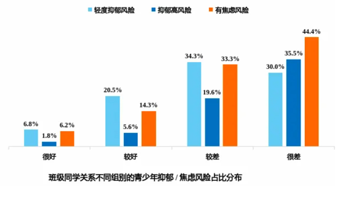 调查结果显示,报告朋友从不给予自己关心的青少年中,有三成存在不同程度的抑郁,焦虑风险比例为19.3%,随着获得朋友关系的频率增加,抑郁和焦虑风险均有所下降。认为班级同学关系很差的青少年中超过1/3的青少年都处于抑郁高风险,总体逾六成存在抑郁风险,超四成有焦虑风险。