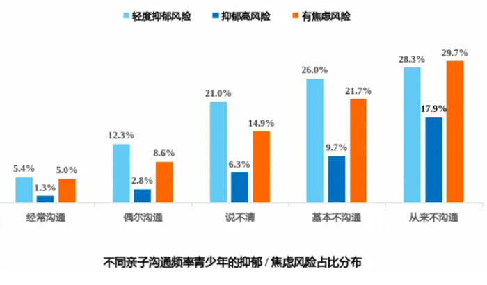 本次调查表明,受母亲情感忽视程度高的青少年存在抑郁风险的比例高达40.1%,焦虑比例也升至23.1%。而母亲情感忽视程度低的青少年中抑郁风险比例为8.2%、焦虑风险比例为5.8%,父亲忽视的结果与此接近。此外,亲子间“进行关于心理健康方面的沟通”的频率越频繁,青少年的抑郁和焦虑风险越低,如在“经常”沟通这组,总体存在抑郁风险的比例为6.7%,抑郁高风险占比为1.3%,焦虑风险比例为5.0%;而当父母从来不就心理健康内容与青少年沟通时,青少年中46.2%都可能存在一定程度的抑郁风险,约18%属于抑郁高风险,近1/3有焦虑风险。