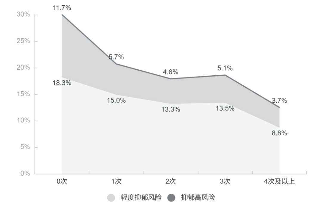 健康生活方式则是重要的保护性因素。随着每周平均运动频率的提高,无论是轻度抑郁风险,还是抑郁高风险的比例都在逐级下降。每周运动≥4次的群体抑郁高风险比例降低为不运动组的三分之一。