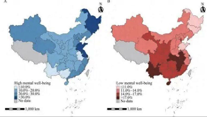 这项大规模调研由北京大学公共卫生学院儿童青少年卫生研究主导。研究人员针对2019年全国学生体质健康调查中收录的内地30个省级行政区(不包括西藏)、近10万名13~18岁青少年的心理健康问卷调查数据展开分析,发现约2.1万名青少年(21%)认为自己幸福感较高,约6.4万名青少年(64.6%)认为自己幸福感一般,约1.4万名青少年(14.4%)认为自己幸福感较低。青少年心理健康水平较高的省份为吉林(39.6%)、黑龙江(33.1%)、上海(32.9%),心理健康水平较低的省份为江西(19.3%)、海南(19.1%)和安徽(18.9%)。
