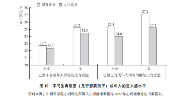 在已婚群体中,子女数量和生育意愿也会影响成年人的人生意义拥有水平,有子女的和生育意愿更高的成年人均显示出更高水平的人生意义感。