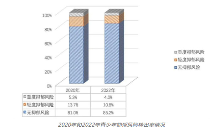报告显示,约14.8%的青少年存在不同程度的抑郁风险,其中4.0%的青少年属于重度抑郁风险群体,10.8%的青少年属于轻度抑郁风险群体,相比2020年的抑郁风险检出率(19.0%)有所下降。调查还显示,女生相对男生有更高的抑郁、孤独得分。