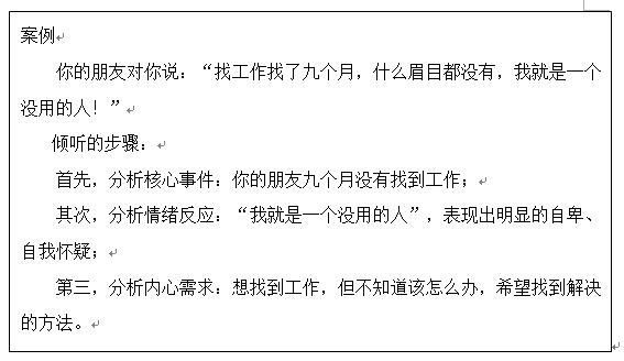 倾听时,需要首先从事实信息入手,抓住对方想表达的核心事件;其次,围绕核心事件,倾听对方所表达的情绪反应;最后,从情绪反应中,分析对方没有明确表达的内心需求。下列案例运用了这个方法。