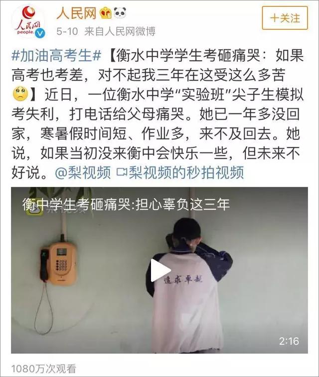 前些天,人民网发了一个视频,衡水中学“实验班”高中女生因模拟考失利,给父母打电话痛哭。