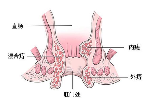 简单来说,痔疮是肛门处的静脉血管扩张或周围组织增生肥大。根据位置,它分为内痔、外痔、混合痔,如下图所示。