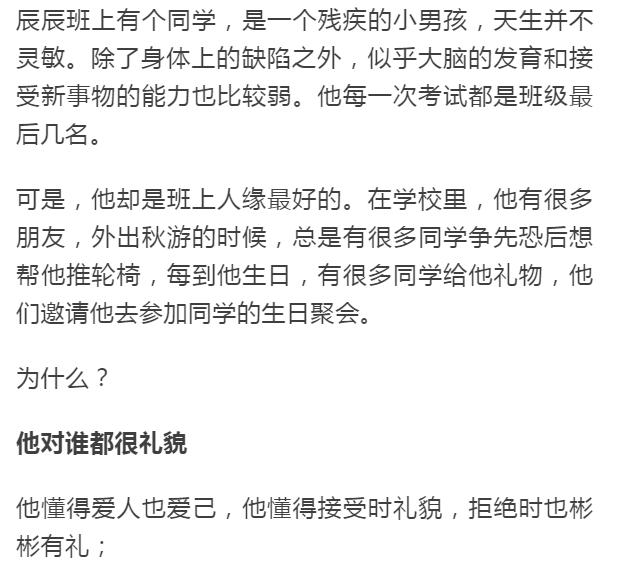 这个男孩子并没有传统定义上的优秀,不一定能够成为职场精英,也可能取得不了所谓的成绩。但是因为他的为人,也就是教养,使他过得并没有那么孤单。
