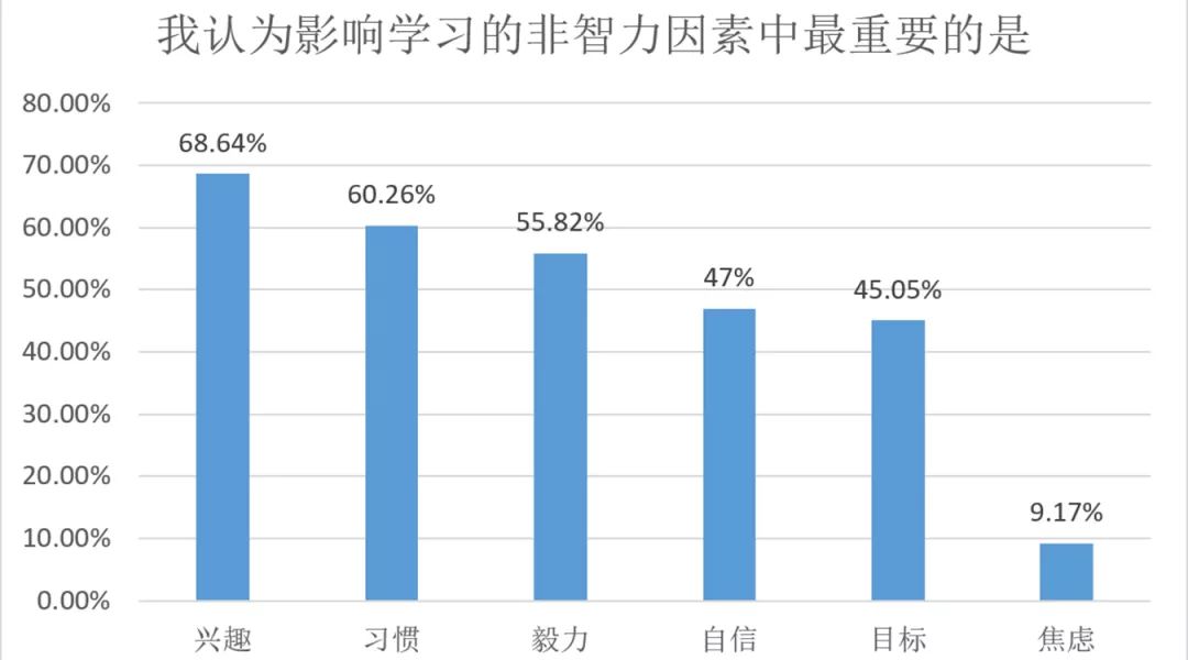 兴趣(68.64%),习惯(60.26%),毅力(55.82%),自信(47.00%),目标(45.05%),焦虑(9.17%)。