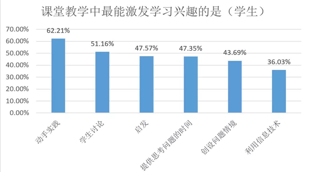 第一,从学生角度看。课堂教学中最能激发学习兴趣的是:动手实践62.21%、学生讨论51.16%、启发47.57%、提供思考问题的时间47.35%、创设问题情境43.69%,利用信息技术36.03%。