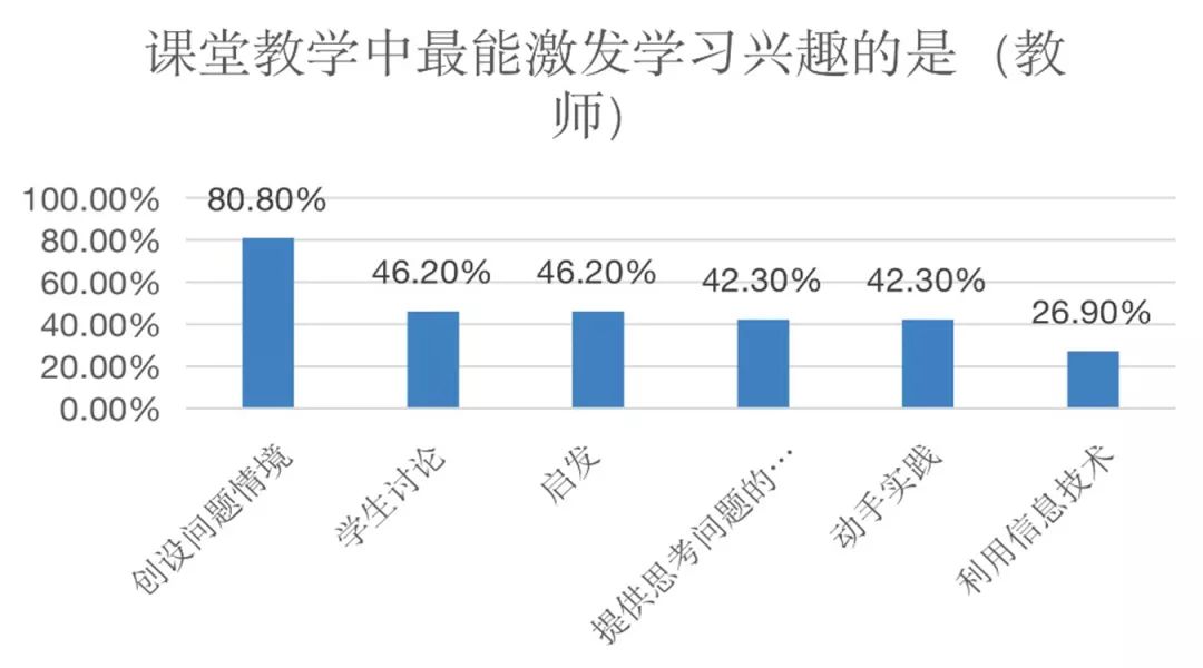 第二,从教师角度看。课堂教学中最能激发学习兴趣的是:创设问题情境80.80%、学生讨论46.20%、启发46.20%、提供思考问题的时间42.30%、动手实践42.30%、利用信息技术26.90%。