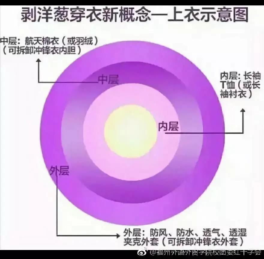 洋葱穿衣法,即多几层、薄一点、易穿脱。内层穿透气、吸汗的纯棉内衣;中层穿保暖、透气的毛衣;外层以防风、防水的外套。