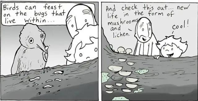 “就连虫子,也可以靠吃树上的蛀虫维持生命。还有,看看这里,蘑菇和青苔是新生命的预兆。”