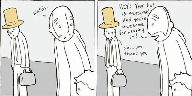 然后我走上去,对着这个路人说,“嗨,你的帽子酷毙了,你带起来好帅!”