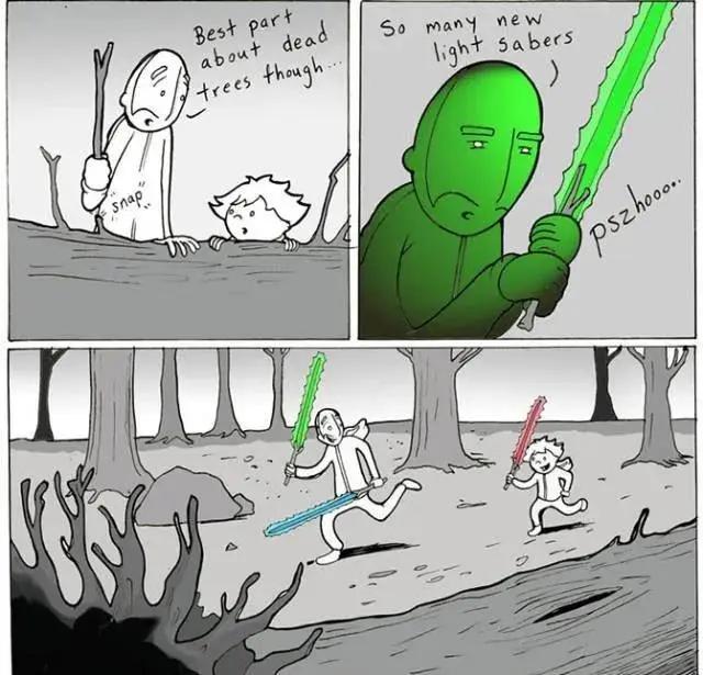 “最棒的是,这些树枝还可以拿来做激光剑!”