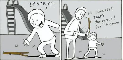 当孩子捡起掉落的树枝时,有一种爸爸会马上说:“不,宝贝,这很危险,把它放下来!”